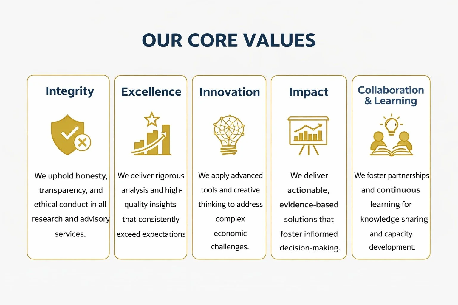 We are driven by integrity, excellence, innovation, and collaboration to deliver rigorous, evidence-based insights that create meaningful economic and policy impact.
